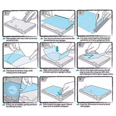 • 1. Make sure your laptop is clean. Wipe it off with a soft cloth. The laptop should be free of dust, fat or grease - otherwise the laptop skin may not stick to your laptop as well as it's supposed to.