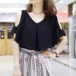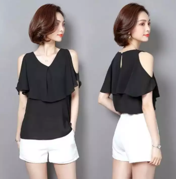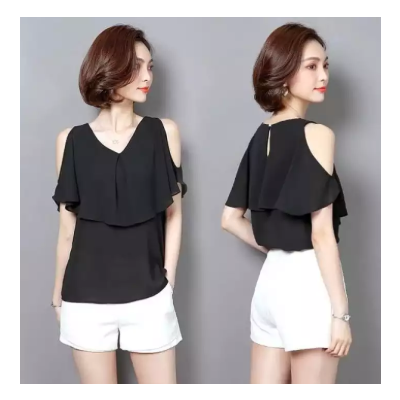 Reviews of Women Loose Half ButterFly Cut Sleeve V - Neck Chiffon T-shirt - Black