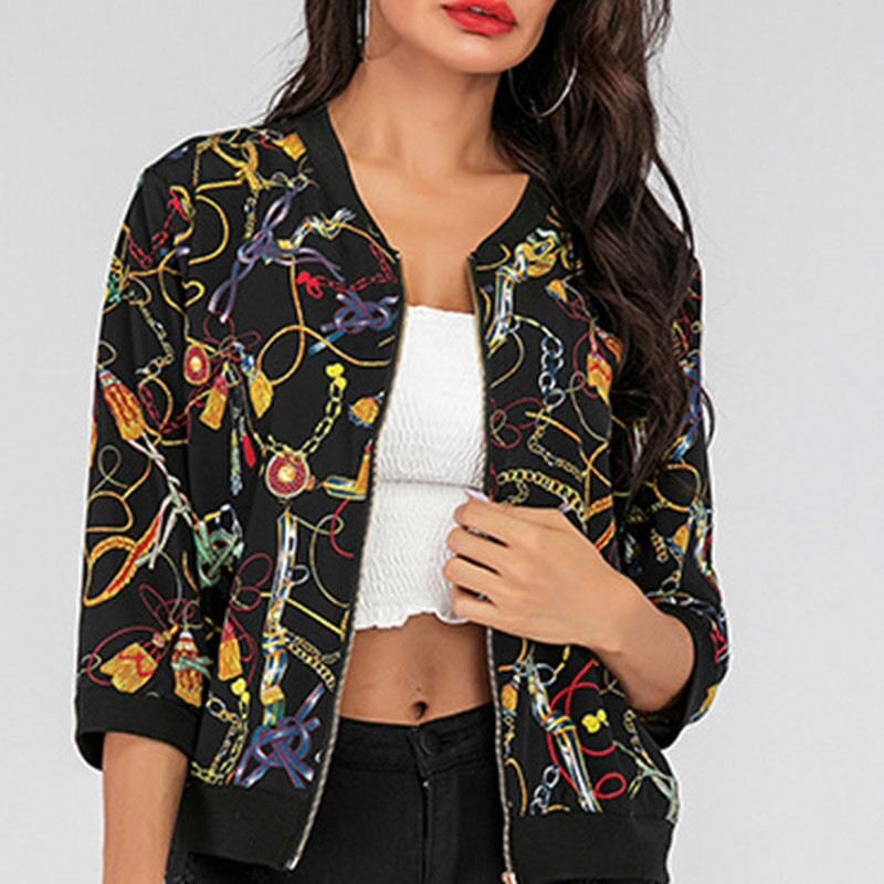 Women's 7-Sleeve Loose Print Sunscreen Zipper Slim Jacket
